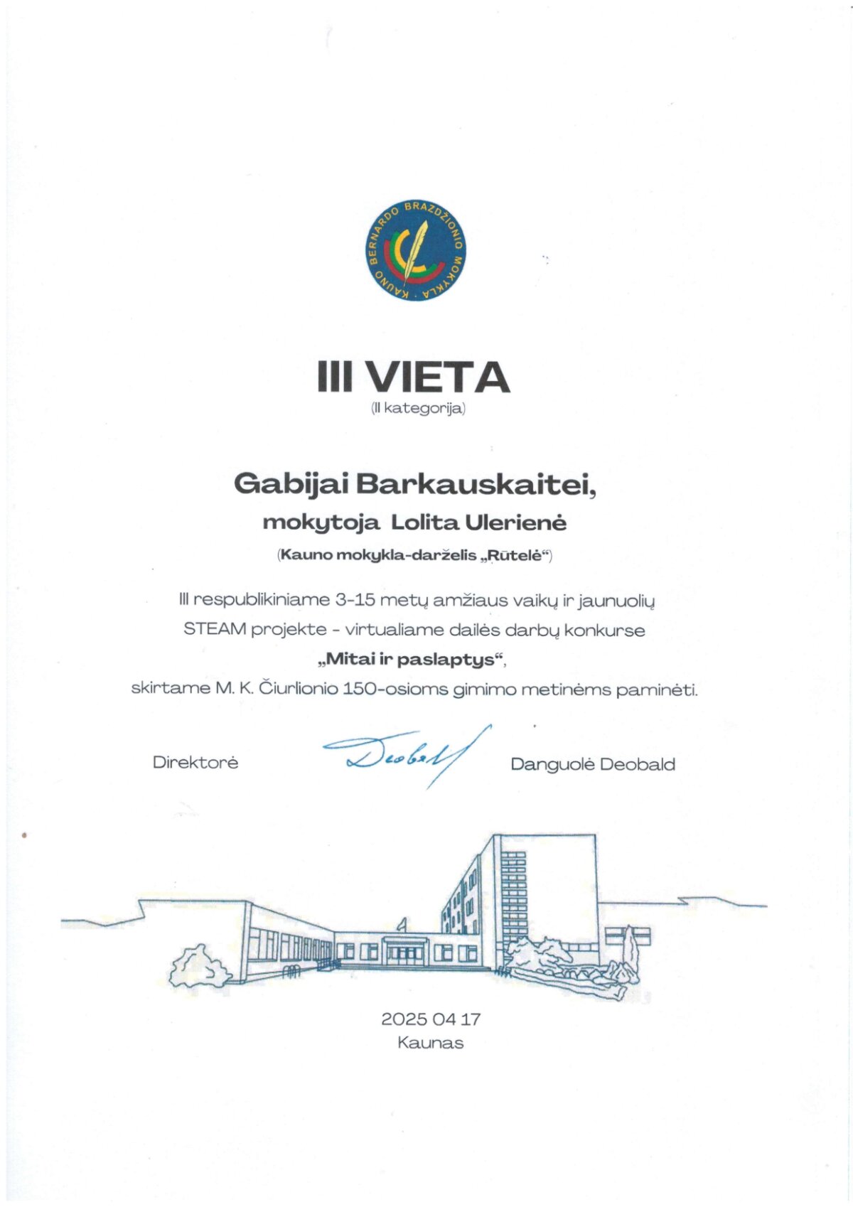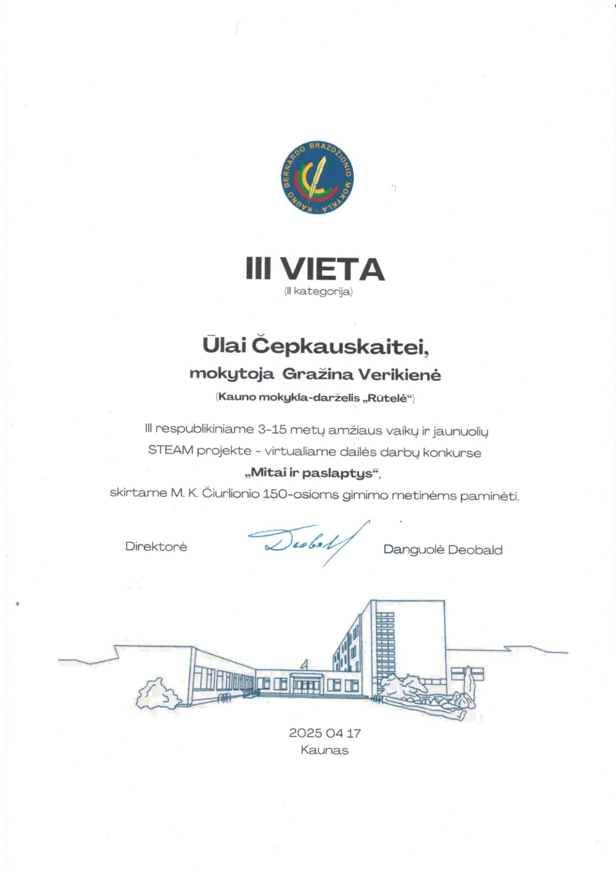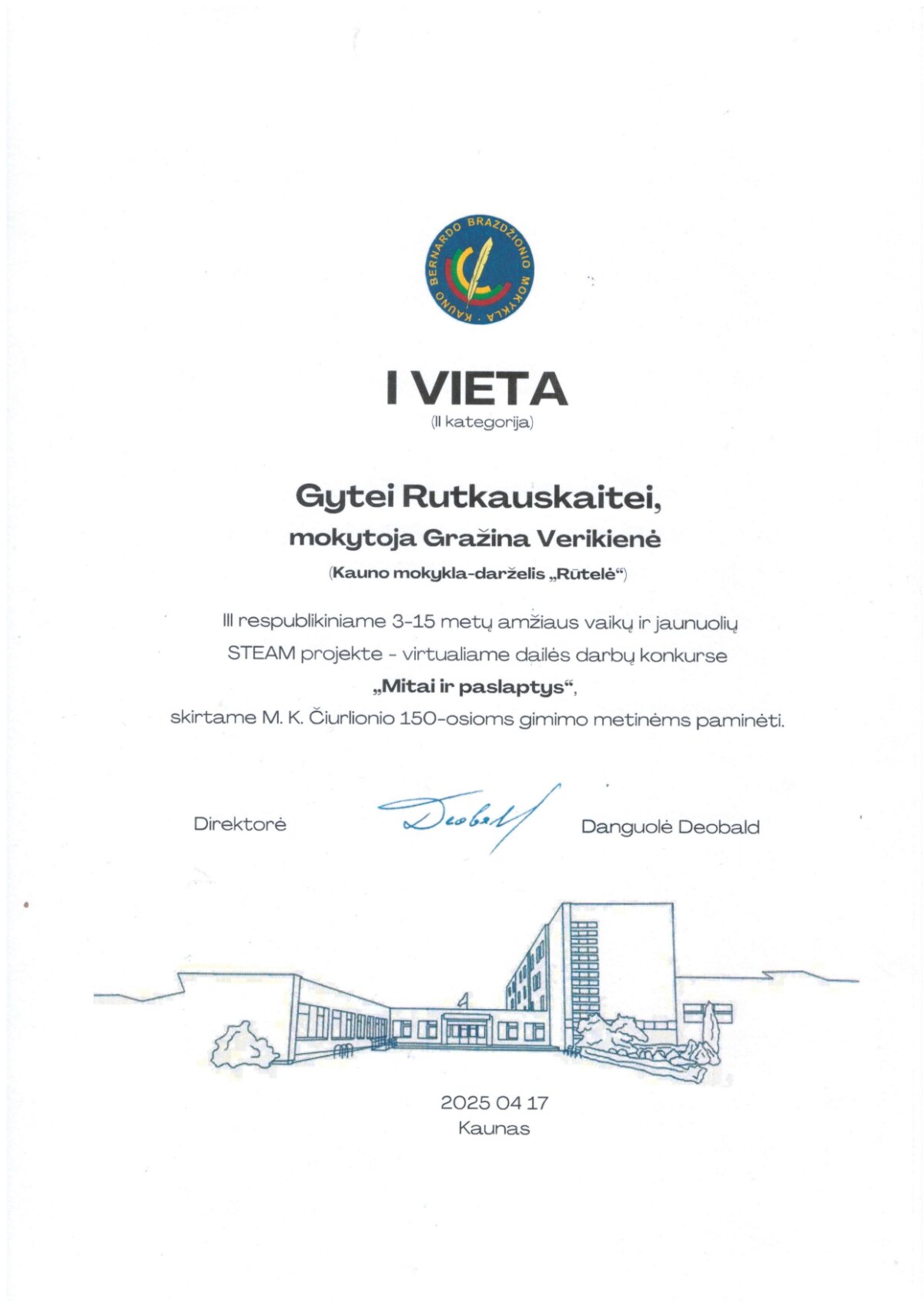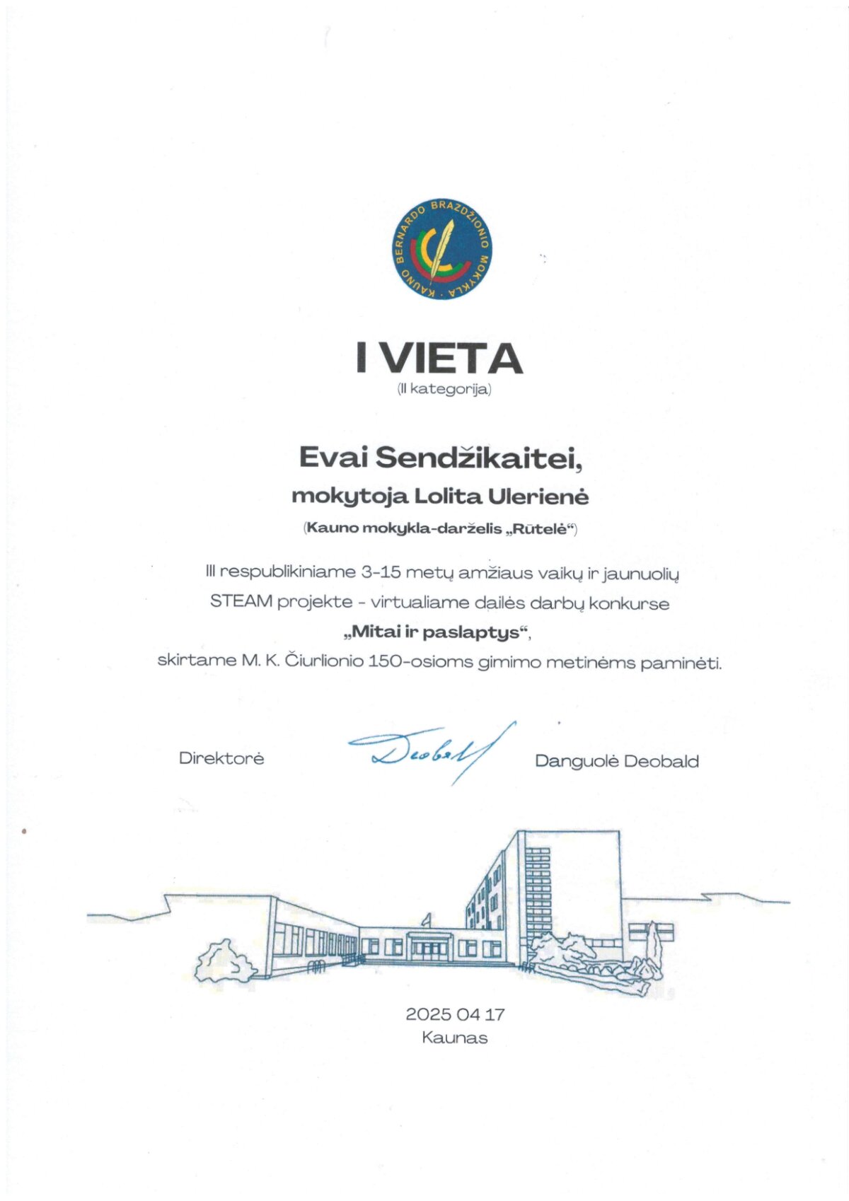 III respublikiniame 3-15 metų amžiaus vaikų ir jaunuolių STEAM projekte – virtualaus dailės kūrybinių darbų konkurse „Mitai ir paslaptys“, skirtame M.K. Čiurlionio 150-osioms gimimo metinėms paminėti apdovanoti 5 mūsų mokyklos mokiniai: Gytė Rutkauskaitė, Eva Sendžikaitė, Aleksija Laškova,Gabija Barkauskaitė, Ūla Čepkauskaitė.
