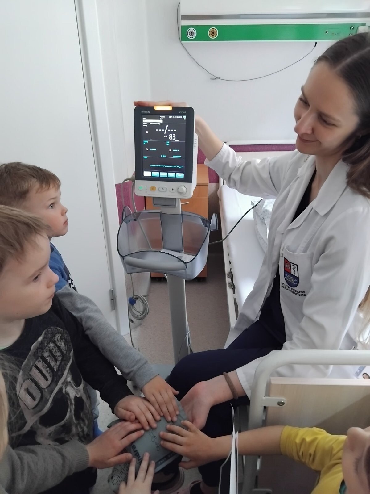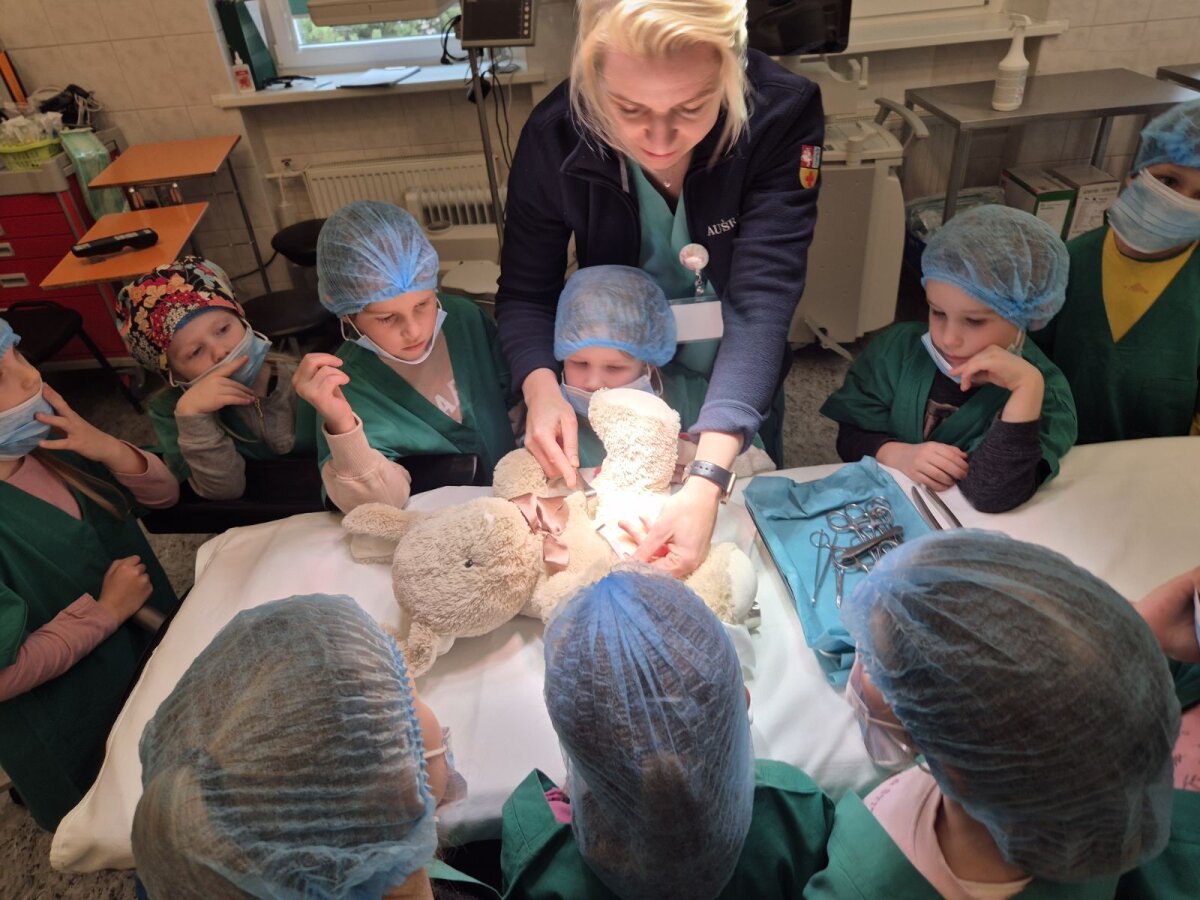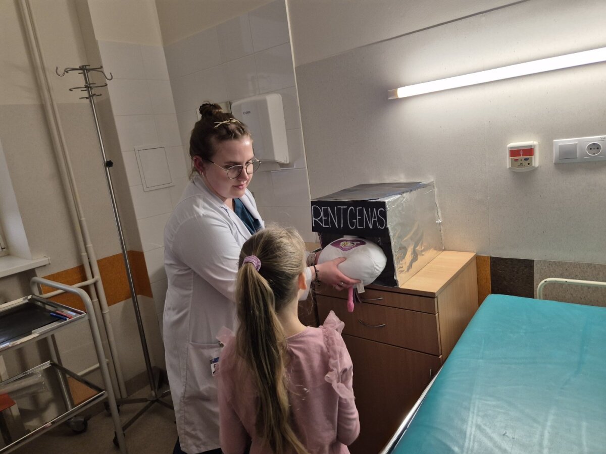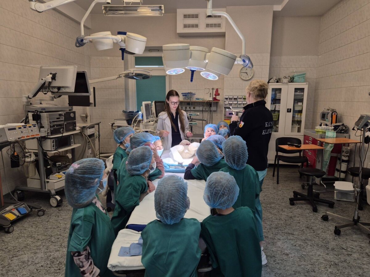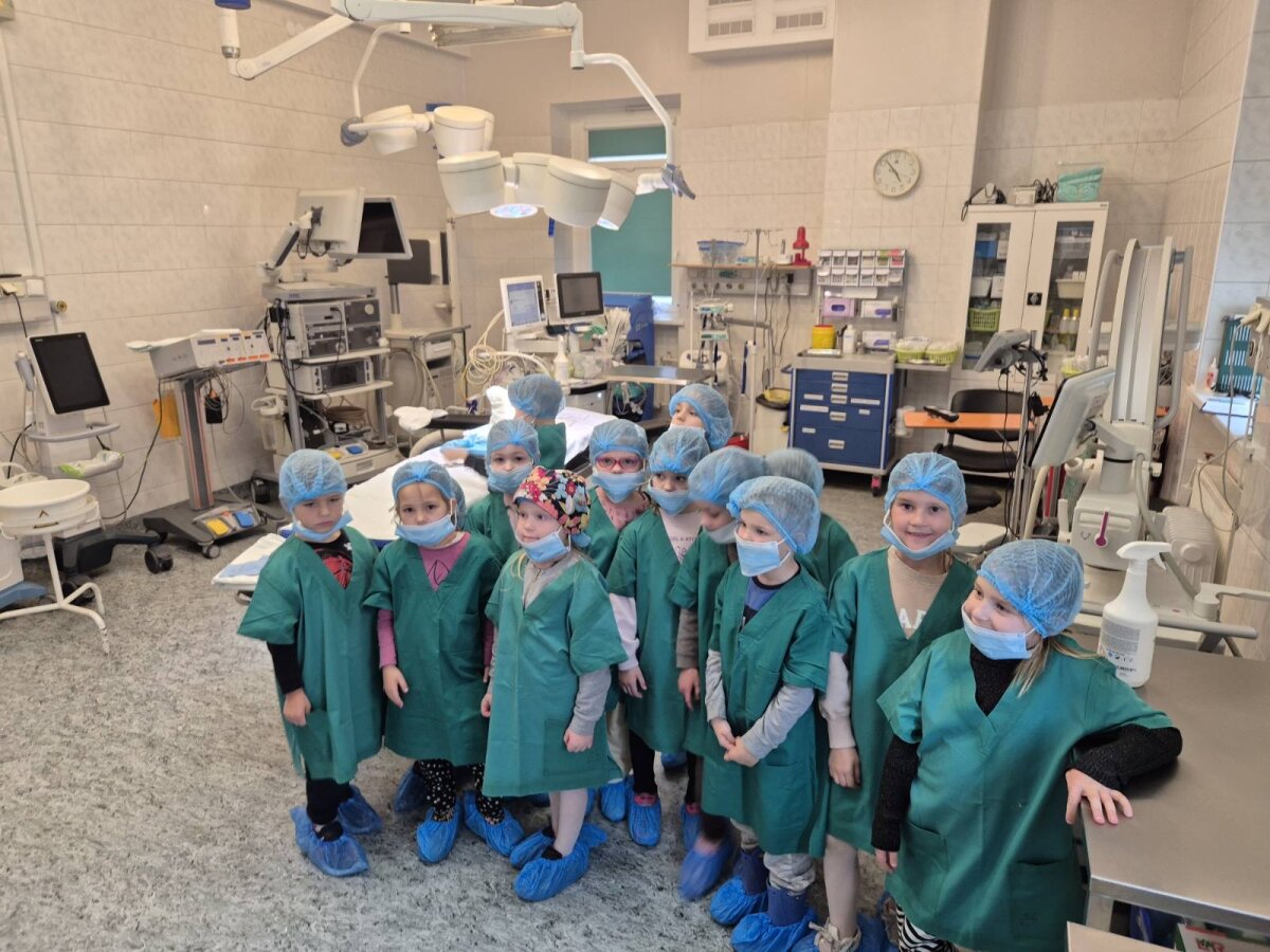 Balandžio 16d. ,,Pelėdžiukų" grupės ugdytiniai keliavo į LSMU ligoninės Kauno klinikas. Vaikų skyriuje juos pasitiko Gretės mama, doc.dr. Aušra Lukošiūtė-Urbonienė ir pasiūlė pažaisti ,,Žaislų ligoninę". Vaikai buvo supažindinti su ligoninės erdvėmis, gydė savo žaislus: tvarstė, vežė į rentgeną, operacinę.