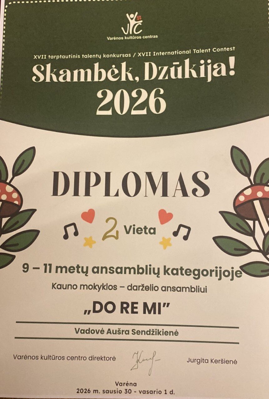 Vasario 1 d. mūsų mokyklos ansamblis „Do Re Mi" dalyvavo Tarptautiniame konkurse „Skambėk, Dzūkija!"2026, kuris vyko Varėnos mieste. Mūsų dideliam džiaugsmui dainininkės užėmė 2 vietą!!! Sveikiname, didžiuojamės ir dėkojame mokytojai Aušrai Sendžikienei už vaikų paruošimą ir mokyklos garsinimą Tarptautiniame konkursuose.