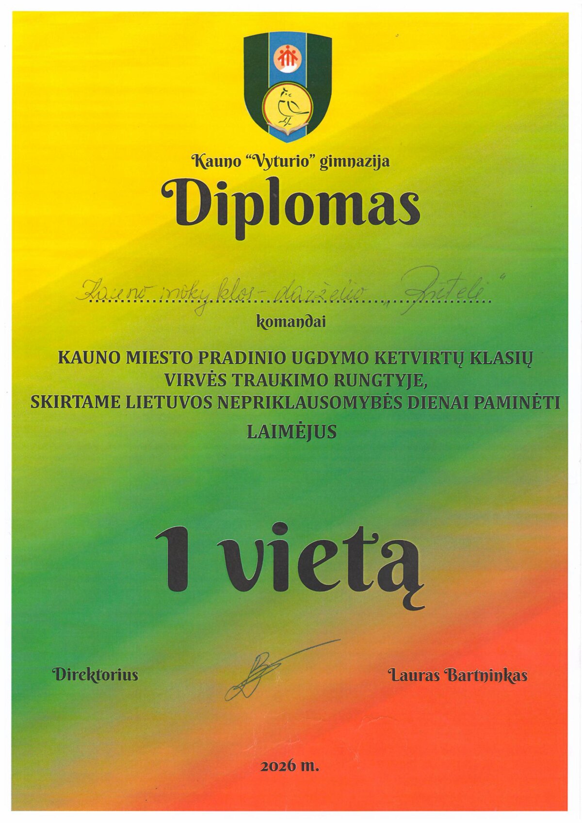 Padėka Kauno miesto mokyklai-darželiui „Rūtelė" už I vietą Lietuvos mokyklų žaid... -