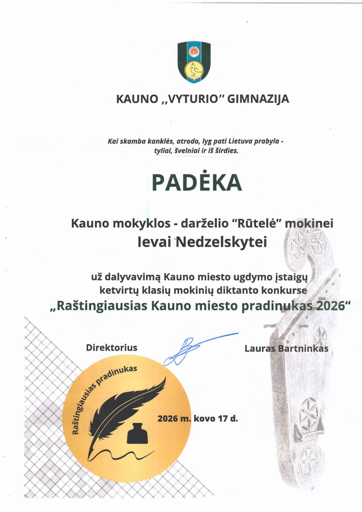 Kovo 17 d. "Vyturio" gimnazijoje vyko Kauno 4 klasių mokinių lietuvių kalbos diktanto konkursas „Raštingiausias Kauno miesto pradinukas 2026". Konkursas skirtas Kanklių metams paminėti.