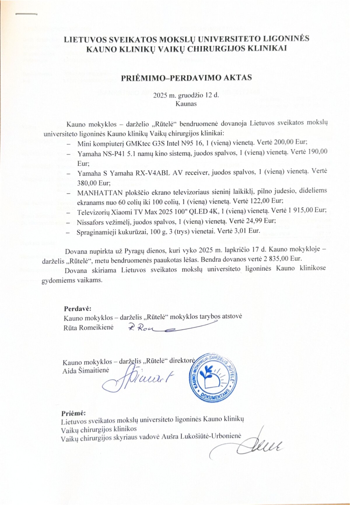 Pyragų dienos metu mūsų mokyklos bendruomenė surinko net 2835 Eur, kurie buvo prasmingai panaudoti vaikų gerovei. Už surinktas lėšas LSMU vaikų chirurgijos klinikai nupirkome kino teatro įrangą.